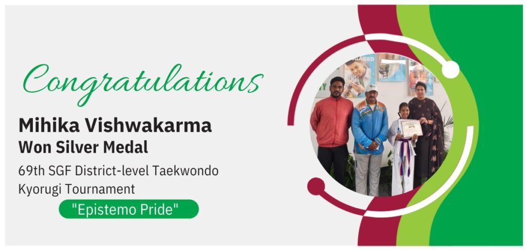 Mihika Vishwakarma showcased her strength, skill, and determination at the 69th SGF District Level Taekwondo Kyorugi Tournament, held at Arca International School, Almasguda (8th–9th Oct 2025).